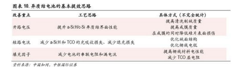 異質(zhì)結(jié)電池仍有進(jìn)一步提效空間:異質(zhì)結(jié)電池轉(zhuǎn)換效率已位居晶硅電池前列,但其仍有進(jìn)一步的提 效空間。在不改變其結(jié)構(gòu)的基礎(chǔ)上,可以從提高開(kāi)路電壓、短路電流、填充因子三方面著手提效。 而異質(zhì)結(jié)電池的內(nèi)部結(jié)構(gòu)亦具備與其他技術(shù)路線或工藝的可疊加性,可在優(yōu)化內(nèi)部結(jié)構(gòu)的基礎(chǔ)上吸 取其他工藝的優(yōu)點(diǎn)進(jìn)一步提高電池轉(zhuǎn)換效率。