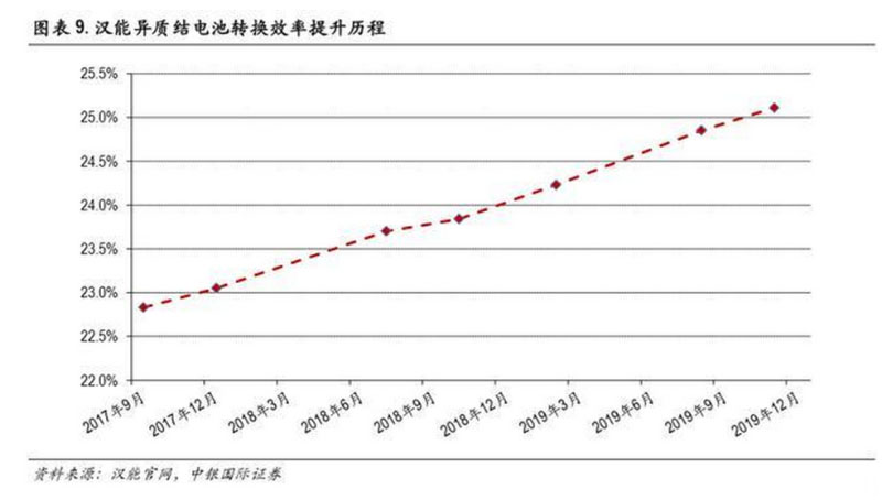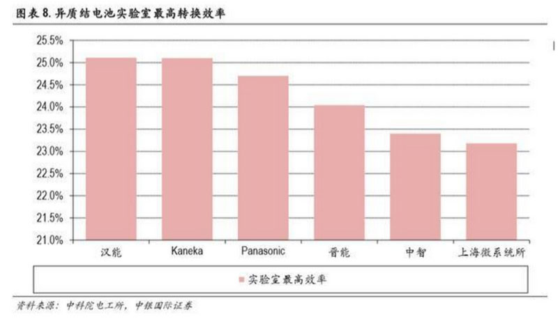 純異質(zhì)結(jié)電池實(shí)驗(yàn)室轉(zhuǎn)換效率已超過(guò) 25%:在日本松下/Sanyo之外,目前國(guó)內(nèi)外對(duì)異質(zhì)結(jié)電池的研究 已大范圍展開(kāi),轉(zhuǎn)換效率亦逐步攀升?,F(xiàn)在在 M2的標(biāo)準(zhǔn)硅片尺寸下,純異質(zhì)結(jié)結(jié)構(gòu)電池的轉(zhuǎn)換效率 世界紀(jì)錄為 25.11%,由我國(guó)漢能成都研發(fā)中心創(chuàng)造,且此轉(zhuǎn)換效率是在使用量產(chǎn)設(shè)備和量產(chǎn)工藝的 前提下取得的,具備相當(dāng)程度的量產(chǎn)可能性。