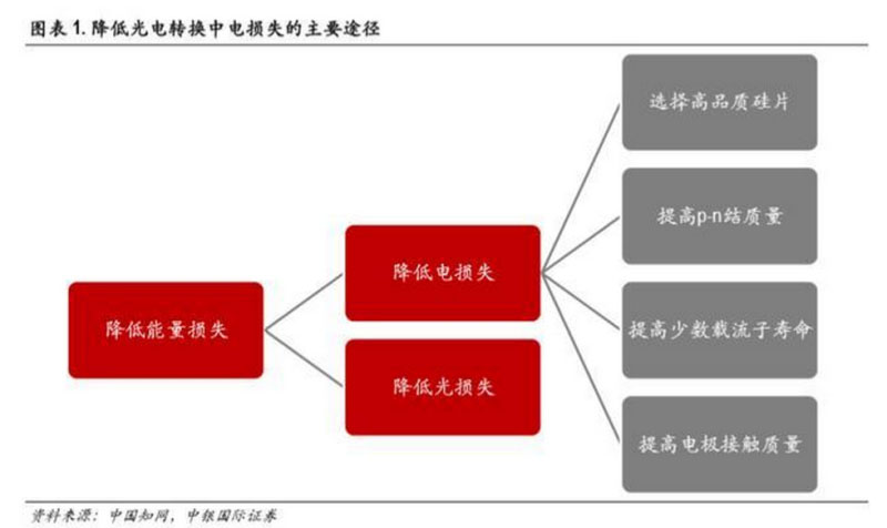 鈍化是提高光伏電池轉(zhuǎn)換效率的重要途徑:一般而言,提升光伏電池片光電轉(zhuǎn)換效率的核心是降低 光電轉(zhuǎn)換過(guò)程中的能量損失,主要是光損失與電損失。其中降低電損失的主要方法包括選擇高品質(zhì) 硅片、提高 p-n結(jié)質(zhì)量、提高少數(shù)載流子壽命、降低材料體電阻等。在提高少數(shù)載流子壽命這一途徑 中,通過(guò)改善晶面缺陷來(lái)降低襯底硅片表面的復(fù)合速率(即鈍化接觸)是光伏電池提效的重要研究 和產(chǎn)業(yè)化方向。