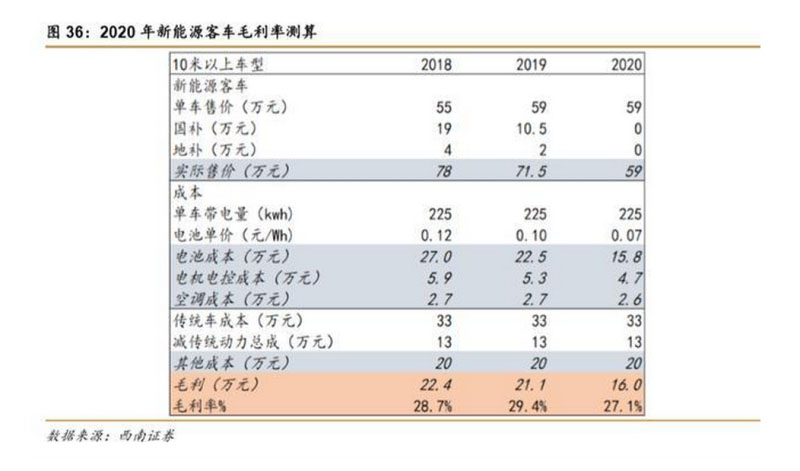 基于 2019 年已經(jīng)有很多一線整機(jī)廠采用 CTP 的方案進(jìn)行上車測試,所以預(yù)計(jì) 2020 年 會(huì)于一部分的車型開始采用該技術(shù)。我們按照上文的假設(shè),以 10 米以上的車型進(jìn)行測算, 電池成本降低 30%,則電池成本從 22.5 萬降低到 15.8 萬,在沒有補(bǔ)貼的情況下,毛利率可 以維持。