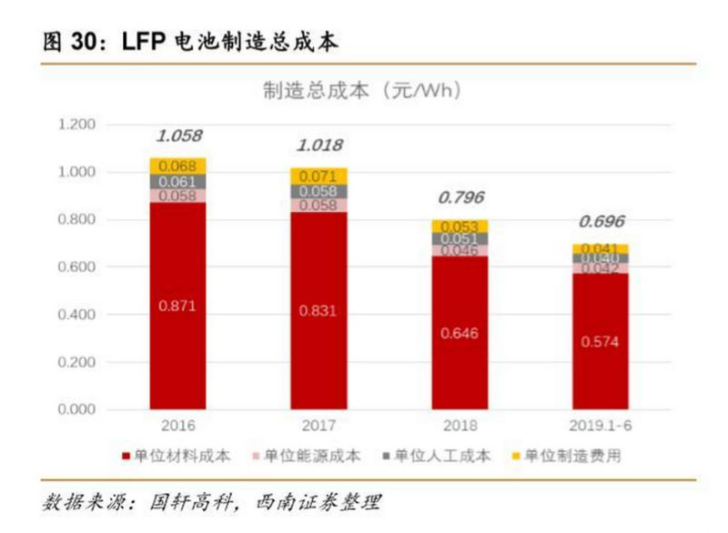 因此根據(jù)上述兩組數(shù)據(jù),我們可以算出 LFP 電池的制造成本。2016 年為 1.058 元/Wh, 而在 2019 年上半年已經(jīng)低于 0.7 元/Wh,主要是由于原材料成本由 2016 年的 0.871 元/Wh 下降到 2019 年上半年的 0.574 元/Wh,絕對(duì)降幅 0.3 元/Wh,相對(duì)降幅 34%。
