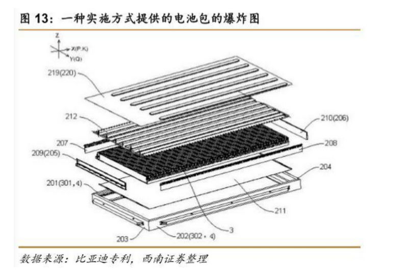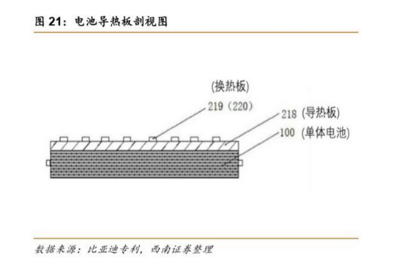 關(guān)于電池模組中散熱性能,比亞迪通過設(shè)置導(dǎo)熱板(下左圖 218 處)和換熱板來進(jìn)行溫 度的控制,以保證單體電池散熱,并保證多個(gè)單體電池之間的溫度差不會(huì)過大。導(dǎo)熱板可以 由導(dǎo)熱性好的材料制成,例如導(dǎo)熱系數(shù)高的銅或鋁等材料制成。換熱板(下右圖 219 處)內(nèi) 部設(shè)置有冷卻液,通過冷卻液來實(shí)現(xiàn)對(duì)單體電池的降溫,使單體電池能夠處于適宜的工作溫 度。由于換熱板與單體電池設(shè)置有導(dǎo)熱板,在通過冷卻液對(duì)單體電池進(jìn)行冷卻時(shí),換熱板各 位置處的溫差可以通過導(dǎo)熱板進(jìn)行均衡,從而將多個(gè)單體電池之間的溫度差控制在 1℃以內(nèi)。