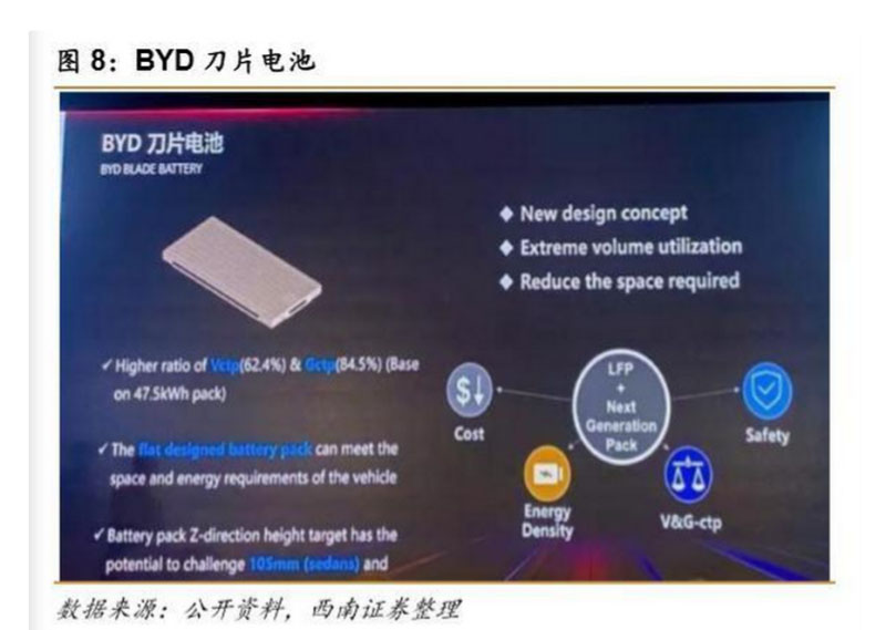 根據(jù)比亞迪專利中的描述,“刀片電池”是比亞迪新一代磷酸鐵鋰電池的一個(gè)名稱,是 比亞迪研發(fā)多年的“超級(jí)磷酸鐵鋰電池”。刀片電池實(shí)為比亞迪開發(fā)的長度大于等于 600mm 小于等于 2500mm 的單體電池,通過陣列的方式排布在一起,就像“刀片”一樣插入到電池 包里面。相比于比亞迪此前的磷酸鐵鋰電池,“刀片電池”的升級(jí)重點(diǎn)在于可實(shí)現(xiàn)無模組, 直接集成為電池包(即 CTP 技術(shù))。刀片電池包通過優(yōu)化電池包結(jié)構(gòu),從而提高電池包之后 的效率,但對(duì)單體能量密度提高沒有太大影響。