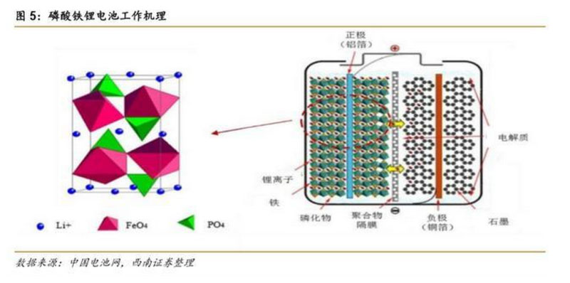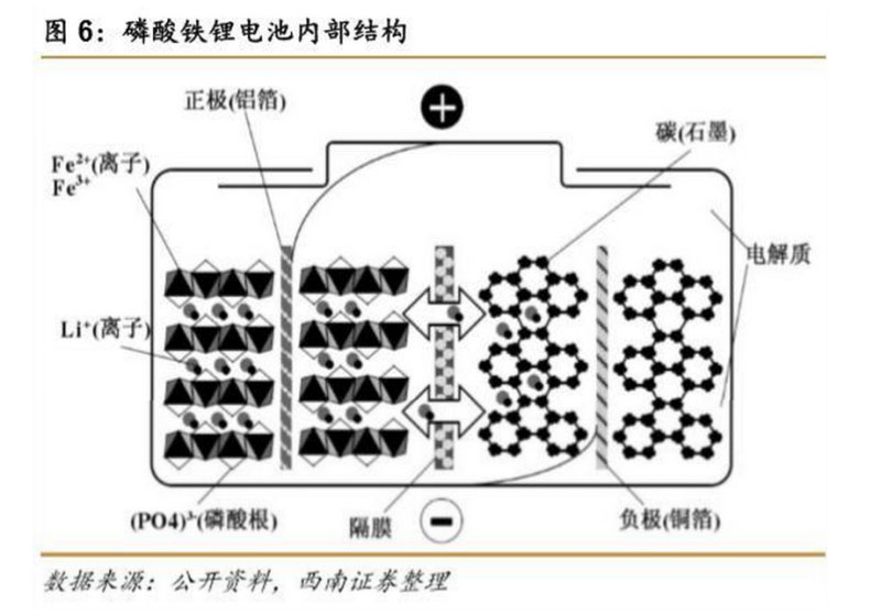 磷酸鐵鋰電池正極由橄欖石結(jié)構(gòu)的 LiFePO4 組成,負(fù)極由石墨組成,中間是聚烯烴 PP/PE/PP 隔膜,用于隔離正負(fù)極、阻止電子而允許鋰離子通過。在充放電的過程中,磷酸 鐵鋰電池正極的離子、電子得失如下: