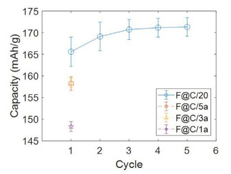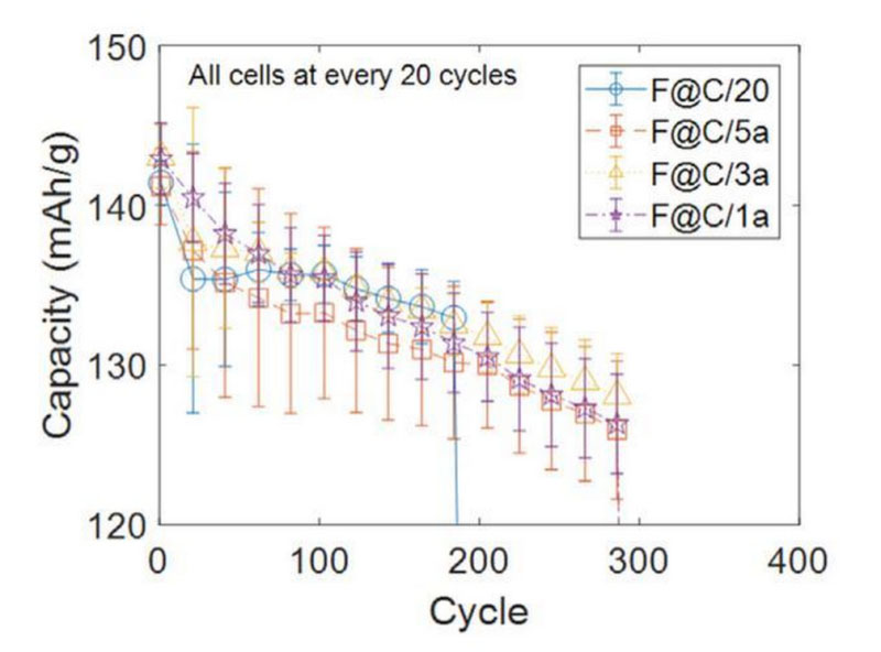 雖然不同的化成電流會導(dǎo)致不同的化成容量發(fā)揮,但是在循環(huán)過程中我們發(fā)現(xiàn)這些電池之間沒有明顯的差距,在1C/1C倍率下循環(huán)的幾種電池的容量發(fā)揮和循環(huán)穩(wěn)定性幾乎相同,表明不同電流下化成的電池,最終負(fù)極表面都形成了穩(wěn)定的SEI膜。因此作者認(rèn)為采用上述的分段式快速化成制度能夠在化成過程中部分的形成SEI膜,然后在鋰離子電池使用的前幾次循環(huán)中最終完成穩(wěn)定SEI膜的構(gòu)建,從而在大幅壓縮化成時間、降低成本的同時還能夠獲得相近的循環(huán)壽命。