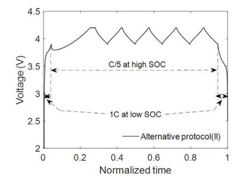 為了壓縮化成時間,降低生產(chǎn)成本,美國橡樹嶺國家實(shí)驗室在1.5Ah的NCM/石墨軟包鋰離子電池上設(shè)計了一種快速化成的制度(如下圖所示),在這一制度下首先以較大的電流(1C)將鋰離子電池充電到3.9V,然后以C/5倍率在3.9-4.2V的范圍內(nèi)對鋰離子電池進(jìn)行充放電循環(huán),最后將電池放電到3.0V,相比于以0.05C倍率進(jìn)行3次循環(huán),該制度下電池的化成時間僅需要14h,化成速度提高8.5倍。這一化成制度的設(shè)計思路主要是將負(fù)極在較低電勢范圍內(nèi)時,充電電流盡量盡可能的小,以使負(fù)極形成更為致密和穩(wěn)定的SEI膜。