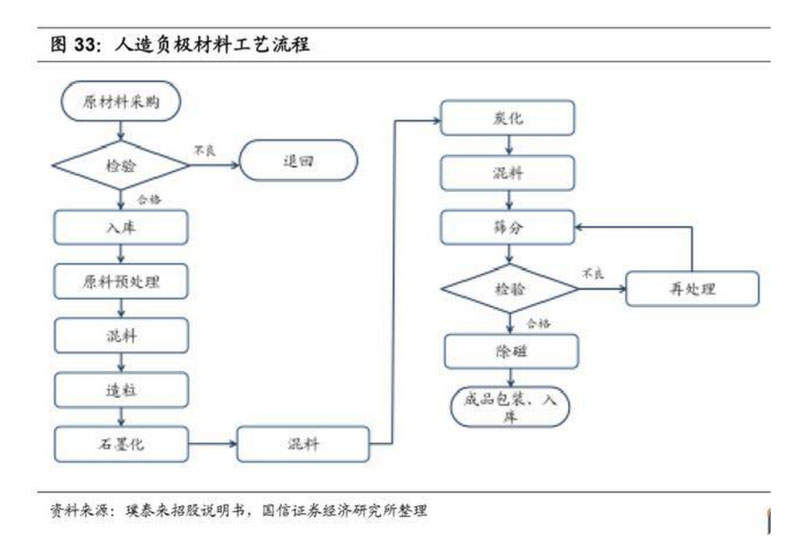 人造石墨負極技術(shù)路線相對比較成熟,更多壁壘集中在造粒工藝上。人造石墨 的理論比容量為 372mah/g,目前主流產(chǎn)品能做到 345-355mah/g,其生產(chǎn)工藝 是將骨料和粘接劑進行破碎、造粒、石墨化、篩分而成,相對于天然石墨負極 的粉碎-球形化-混合-過篩-磁選過程,人造石墨負極多了造粒-石墨化和二次造粒 三個關(guān)鍵過程,各家基本工序流程是一致的,但又會有一定的差異,如炭化環(huán) 節(jié)和改性環(huán)節(jié)、篩分次數(shù)等。