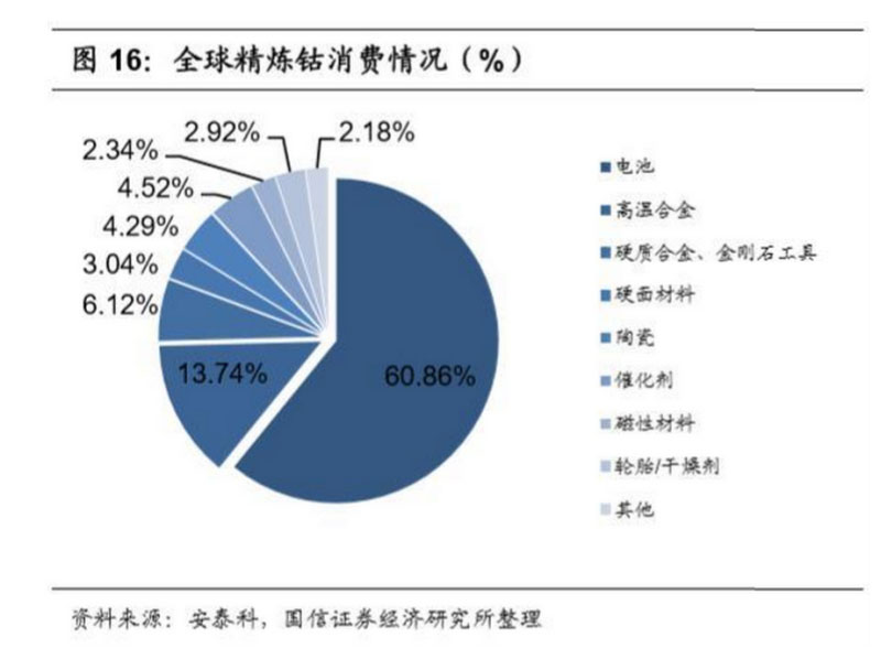 鈷的物理、化學(xué)性質(zhì)決定了它是生產(chǎn)耐熱合金、硬質(zhì)合金、防腐合金、磁性合 金以及各種鈷鹽的重要材料、下游被廣泛應(yīng)用于電池、制取合金、制取顏料、 醫(yī)療等領(lǐng)域。根據(jù)安泰科統(tǒng)計,2018 年全球精煉鈷總體需求量約為 12.6 萬噸, 同比增長接近11.5%,其中電池行業(yè)用鈷量約為7.8萬金屬噸,占比約為60.86%, 高溫合金用鈷量約為 1.76 萬金屬噸,占比約為 13.74%,其他行業(yè)用鈷量較為 平均;而中國鈷消費量約為 6.47 萬噸,同比增速達到 19.81%。2019 年以來受 全球經(jīng)濟不確定性影響以及中美貿(mào)易戰(zhàn)為代表的國家間的貿(mào)易保護對消費起到 一定的抑制作用,鈷下游領(lǐng)域 3C 市場處于低迷期,航空業(yè)以及硬質(zhì)合金等行 業(yè)均受到波及,新能源汽車領(lǐng)域一枝獨秀但基數(shù)較小。