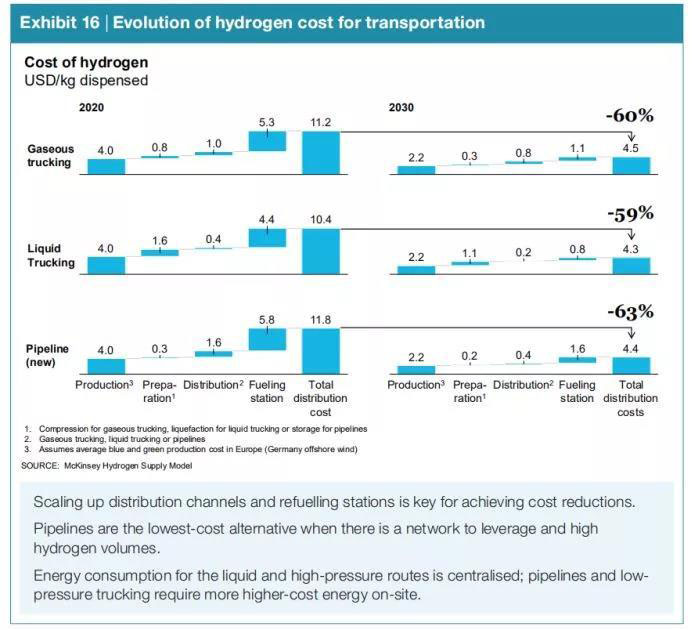對于典型的300至500公里的距離,氣態(tài)和液態(tài)氫運輸?shù)某杀緫档兔抗?.10美元至0.20美元,這是由于利用率提高以及隨著規(guī)模擴大、設備成本降低。