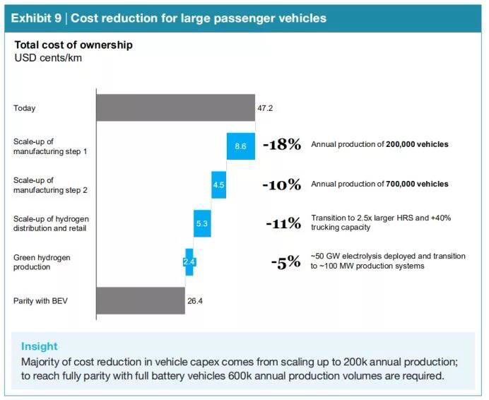 到2030年,大型乘用車的TCO可能下降約45%,這主要受三個主要因素的影響:低成本的汽車資本支出,低成本的氫氣分銷和零售以及低成本的氫氣生產(chǎn)。這些成本降低對于實現(xiàn)與BEV的成本均等至關重要。