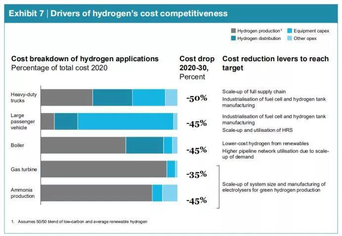 報告指出,氫能解決方案的成本將在未來10年急劇下降,遠遠超出此前預期。隨著氫氣生產(chǎn)、分銷、裝備和零部件制造規(guī)模不斷擴大,預計到2030年氫能產(chǎn)業(yè)鏈整體成本將下降50%。