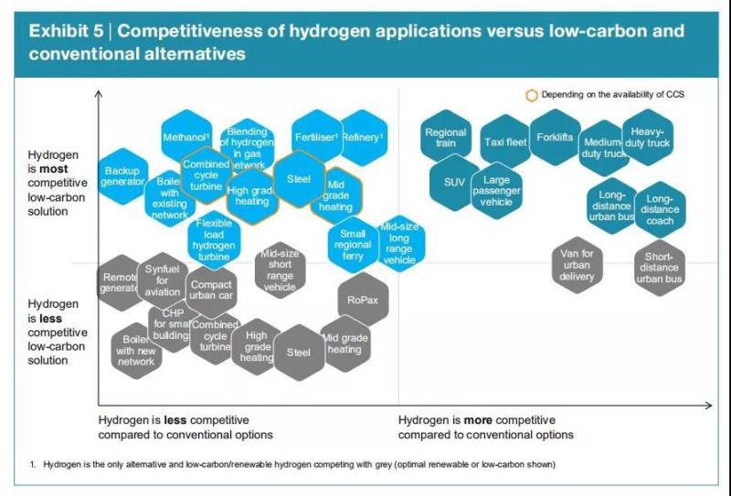 該報告確定了22種氫能應用,在適當?shù)臈l件下,氫可以在2030年之前成為具有成本競爭力的低碳解決方案,并假定了之前提到的擴大規(guī)模。這些例子包括長途運輸應用和區(qū)域火車,它們在低碳替代品方面具有很高的競爭力,如它們在圖5的y軸上的較高位置所示。
