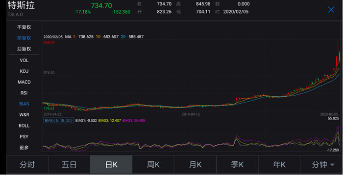 近日資本市場(chǎng)上的表現(xiàn),讓“特斯拉”與“瘋狂”兩個(gè)詞語(yǔ)常常同時(shí)出現(xiàn)。繼上一個(gè)交易日特斯拉日K線幾近收成銳利的“十字”,盤中股價(jià)一度逼近千美元之后,《中國(guó)經(jīng)營(yíng)報(bào)》記者注意到,美東時(shí)間2月5日,特斯拉未能延續(xù)“瘋狂”,股價(jià)低開后跌至734.70美元/股,跌幅17.18%。