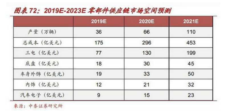 特斯拉2019年-2023年零部件供應(yīng)鏈?zhǔn)袌?chǎng)空間預(yù)測(cè)。數(shù)據(jù)來(lái)源:中泰證券