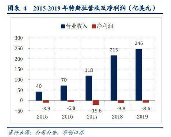 “特斯拉2015年至2019年?duì)I收翻5倍,從2019年三季度起再次實(shí)現(xiàn)盈利。特斯拉2019年實(shí)現(xiàn)營(yíng)業(yè)收入246億美元,相比2015年40億美元四年增長(zhǎng)500%,四年復(fù)合增速57%。前期由于公司的產(chǎn)銷量規(guī)模限制和較高的研發(fā)投入持續(xù)虧損,2019年三季度、四季度特斯拉分別實(shí)現(xiàn)凈利潤(rùn)1.4億美元、1.1億美元開(kāi)始盈利。預(yù)計(jì)隨著規(guī)?;嵘椭袊?guó)工廠投產(chǎn)降本,特斯拉盈利能力將持續(xù)改善?!比A創(chuàng)證券在研報(bào)中如此解釋。
