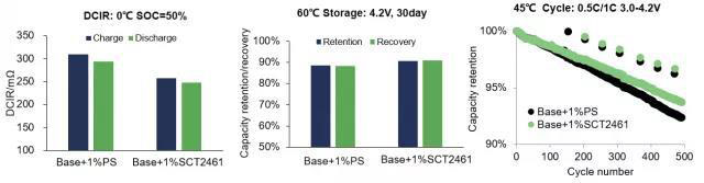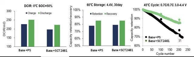 該添加劑在高鎳電池中性能表現(xiàn)優(yōu)異,可替代DTD,LiPO2F2等,在電池DCIR、高低溫性能兼顧方面具有優(yōu)勢,并且有PCT專利布局。