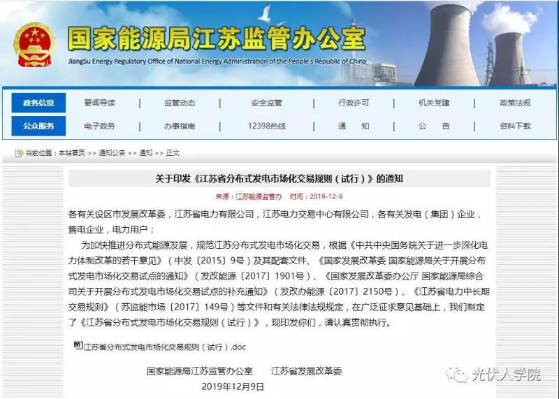 2019年12月9日,江蘇能源監(jiān)管辦、江蘇省發(fā)展改革委制定并發(fā)布《江蘇省分布式發(fā)電市場化交易規(guī)則(試行)》(文件原文見附件),要求各有關企業(yè)和部門認真貫徹執(zhí)行,進一步規(guī)范江蘇分布式發(fā)電市場化交易,加快推進分布式能源發(fā)展。
