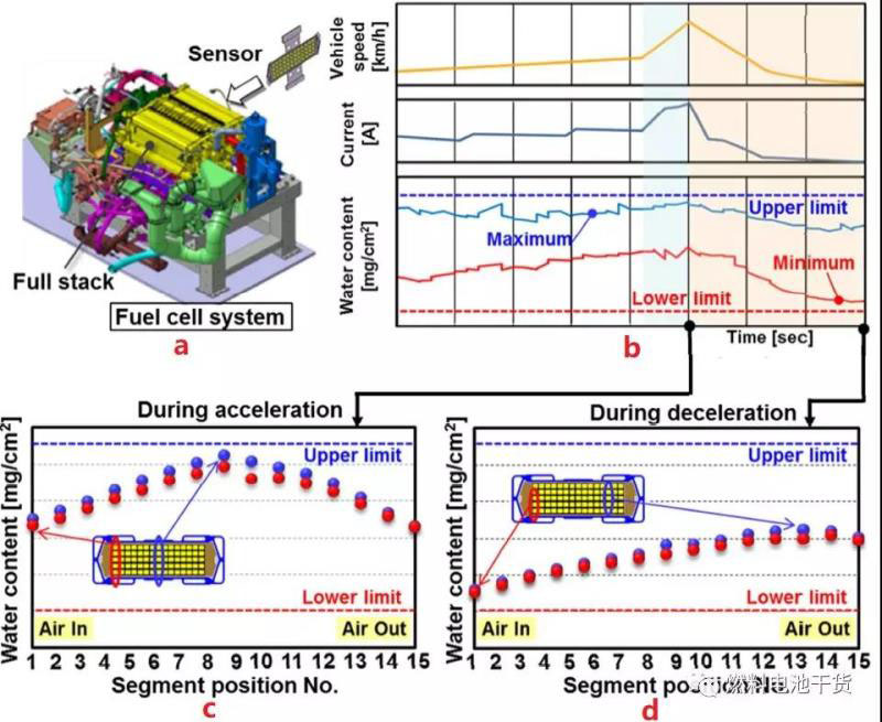 由于在減速之前的高電流發(fā)電使電堆溫度升高,因此飽和水蒸氣含量較高,并且電堆出口排水量增加。減速過程中,由于空氣供應響應延遲導致空氣體積流量過大。這些因素協(xié)同作用導致進氣口附近的平面CCM含水量下降。其實,在每種情況下,都應將確保燃料電池堆耐久性所需的平面CCM水含量保持在上限值和下限值之內。