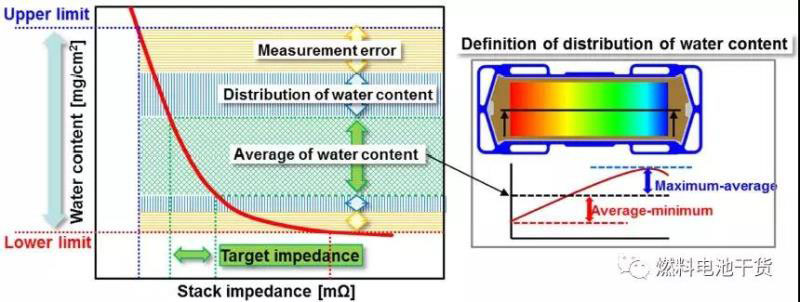 本田CLARITY燃料電池系統(tǒng)配有加濕器,其與旁路閥并聯(lián),如上圖所示。根據(jù)CCM含水量和電堆阻抗的關系特性(下圖),依據(jù)測得的電堆阻抗將確保電堆耐久性所需的CCM含水量控制在圖中所示的上限和下限內(阻抗平均值)。測量誤差和含水量分布是包含在電堆阻抗/CCM含水量特性圖中的指標,如下圖。目標阻抗顯示了電堆阻抗的控制范圍。平面內CCM水分布變化較小會導致控制區(qū)間可能擴展。本田汽車公司在多種燃料電池運行條件下都進行了模擬研究,以優(yōu)化平面內CCM的水分布。