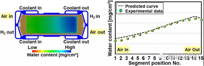 目前市場上存在幾種商用燃料電池模擬軟件。該項研究選擇了市場上某型燃料電池仿真軟件,該軟件針對車用燃料電池堆開發(fā)具有足夠的仿真精度和效率。通過結合水分布的實驗結果并修改原始函數(shù),開發(fā)了CCM平面水分布的仿真模型。上圖分別顯示了CCM平面內水分布的模擬結果以及模擬和測量結果的比較情況??梢钥闯觯M結果和測量結果之間有很好的對應關系。此外,通過使用樹脂框架來優(yōu)化氫氣和空氣的分布,可使燃料電池活性面積較短一側方向上的水分布變化(不一致性)降至最低。