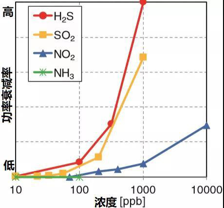 下圖展示了每種雜質濃度與功率衰減率之間的關系。在雜質濃度相似情況下,與硫基雜質相比,NO2對功率降低的影響較小。從上述影響燃料電池性能的空氣雜質表格中可以看出,大氣中硫基雜質的最大濃度為1000 ppb,而某些環(huán)境中的NO2濃度超過1000 ppb。因此,在NO2濃度高的區(qū)域,功率也會受到影響。在預期的100 ppb實際濃度下(參見上述空氣雜質表格),NH3不會影響功率。此外,該研究證實濃度低于1000 ppb的NH3對功率衰減基本沒影響。