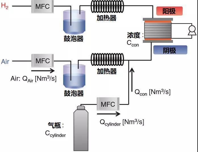 研究中使用了由十片Clarity燃料電池單體組成的短堆,實驗裝置示意如下圖所示。 使用鼓泡系統(tǒng)對高純度氫氣進行加濕和加熱,以達到實際車輛中電堆所提供氣體相似條件。將除去雜質的空氣(以下稱為“清潔空氣”)加濕并加熱,通過連接到電堆陰極進氣管的T形接頭混合指定含量的雜質,將此混合物作為氧化劑氣體提供給電堆。