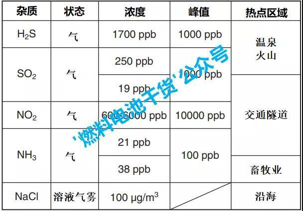 關于空氣雜質對燃料電池功率(性能)的影響,目前大多數(shù)研究和報道針對商用小型電池(例如JARI電池)。迄今為止,尚未見使用實際車用燃料電池的研究案例。通常,小型電池使用的蛇形流場不同于實際車用電池流場。因此,空氣及其雜質的擴散行為也不同。因此,雜質對降低功率的效果可能不同于實際車輛中的效果。下表顯示了影響燃料電池堆功率的典型大氣雜質,硫基氣體(H2S和SO2)和氮基氣體(NO2和NH3)。這些雜質的濃度受多種因素影響,例如地理環(huán)境和天氣條件,使得僅通過現(xiàn)場試驗來定量評估各種雜質的影響不切實際。因此,該項研究進行了臺架試驗,向實際車用燃料電池的陰極側通入模擬包含不同雜質濃度的大氣。