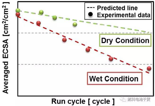 為確保燃料電池耐久性,必須保持一定的催化劑活性表面積和電解質膜厚度。催化劑有效表面積會顯著影響電池性能輸出,一定厚度的電解質膜確保將氧氣和氧氣分開,使陽極和陰極絕緣。催化劑層表面積和PEM厚度的維持受CCM水含量影響較大。當水含量較高,催化劑融解、團聚和再沉積引起催化劑有效活性面積減小。