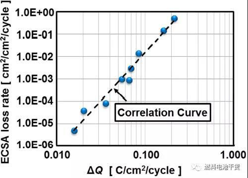 此處,Q1是ULP處PtO膜中總電荷,Q2是因LLP還原后PtO中的殘余電荷。為在性能和△Q之間建立聯(lián)系,研究了作為性能的因素ECSA與△Q之間的關系,即對測試電池進行電壓循環(huán)測試以確定ECSA損失率和△Q之間關系。通過對燃料電池堆中電壓變化進行建模,并使用啟停和加減速時車輛不同狀態(tài)參數(shù)來設置△Q。下圖展示了ECSA損失率與△Q之間關系。結果表明,ECSA損失率可以用△Q表示,以綜合考慮車輛啟停和運行過程中電勢、溫度和其他因素的變化影響。