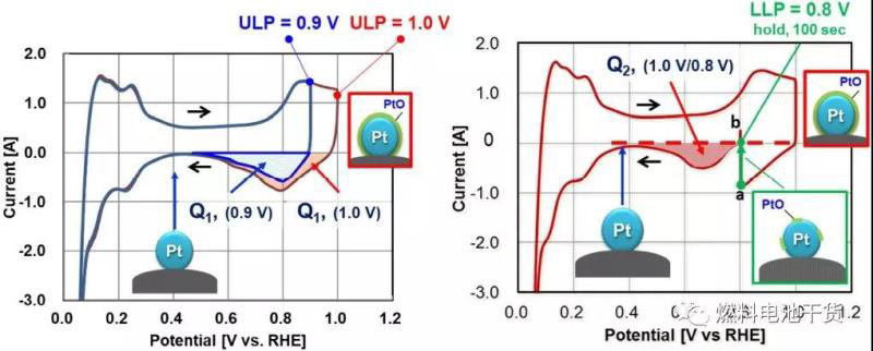 在該項研究中,本田研究了啟動過程中峰值電位的影響。結果表明,較高的ULP導致由電位增加形成的PtO膜中還原電流增加。此外,PtO膜中還原電流不僅與ULP不同,持續(xù)時間也不同。經(jīng)過研究行駛中車輛在加減速過程中谷值電位(LLP)的影響后發(fā)現(xiàn),控制LLP不變,ULP產生的Q1從a減少到b。由于LLP保持不變,在ULP處形成的PtO減少,并且由于PtO部分返回其金屬態(tài)導致電荷下降。