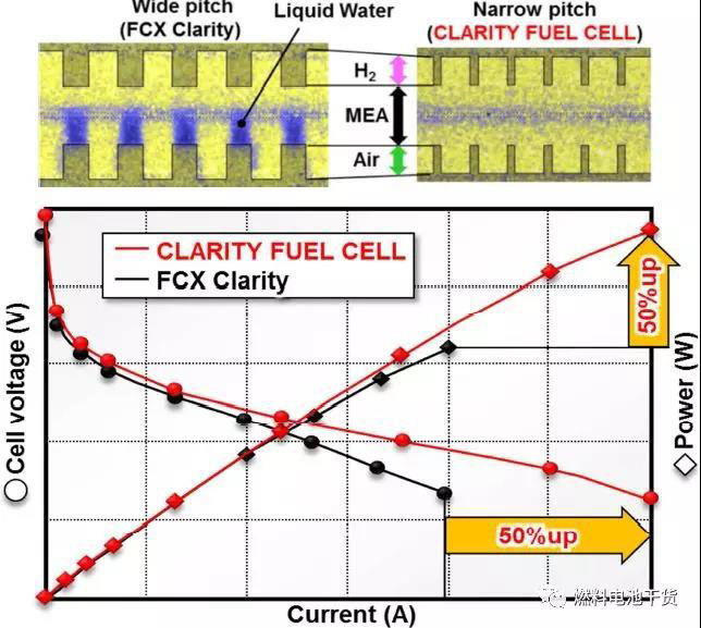 氣體流道深度的降低進一步降低了流道周期,有效緩解了氣體擴散層中水凝結和積累,提高氣體擴散性能,實現(xiàn)電堆內每片電池發(fā)電性能提高1.5倍。伴隨電池厚度薄化和性能優(yōu)化,本田Clarity燃料電池體積功率密度提高了60%,電堆數(shù)量減少30%,電堆尺寸減少33%。