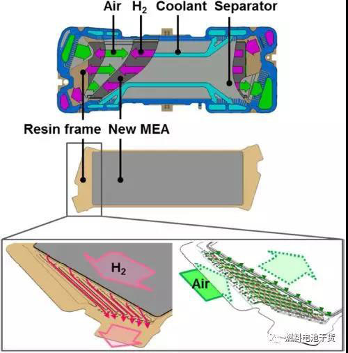 傳統(tǒng)雙極板由雙極板組件(陰陽極板)和膜電極組成的單電池經(jīng)過串聯(lián)層疊形成。本田Clarity燃料電池通過波紋性流場強化氣體傳質,以雙片MEA+三片極板組成一個單元(雙電池)減少燃料電池堆體積。除使用超薄MEA外,采用逆流進氣達到循環(huán)電化學產物水目的。此外,通過使用樹脂框架實現(xiàn)最佳氣體分布特性,實現(xiàn)CCM內水分分布均勻。再者,通過濕度反饋控制降低水含量。上述技術有效降低了氣體流道深度,并減小20%體積,從而實現(xiàn)了1mm電池厚度。