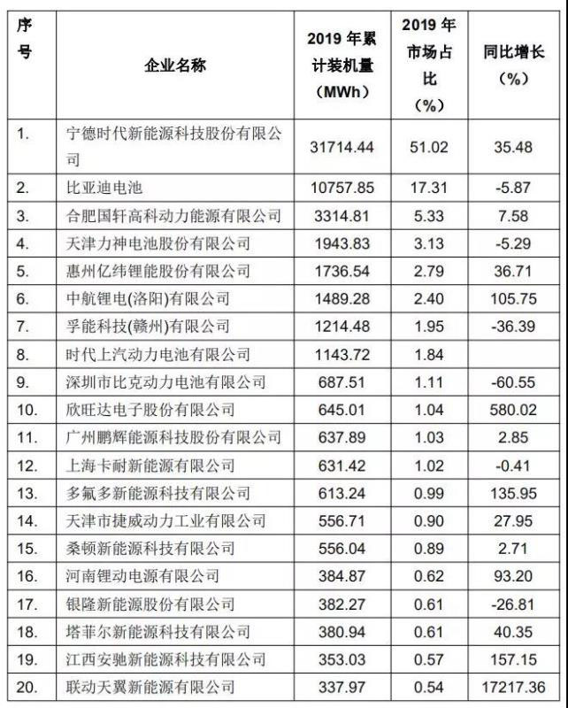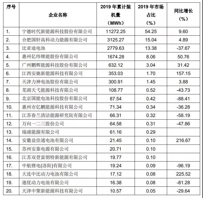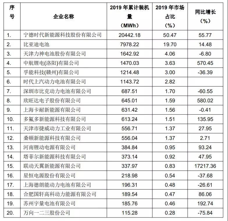 表一 2019年中國(guó)動(dòng)力鋰離子電池企業(yè)裝機(jī)量排名前20強(qiáng)