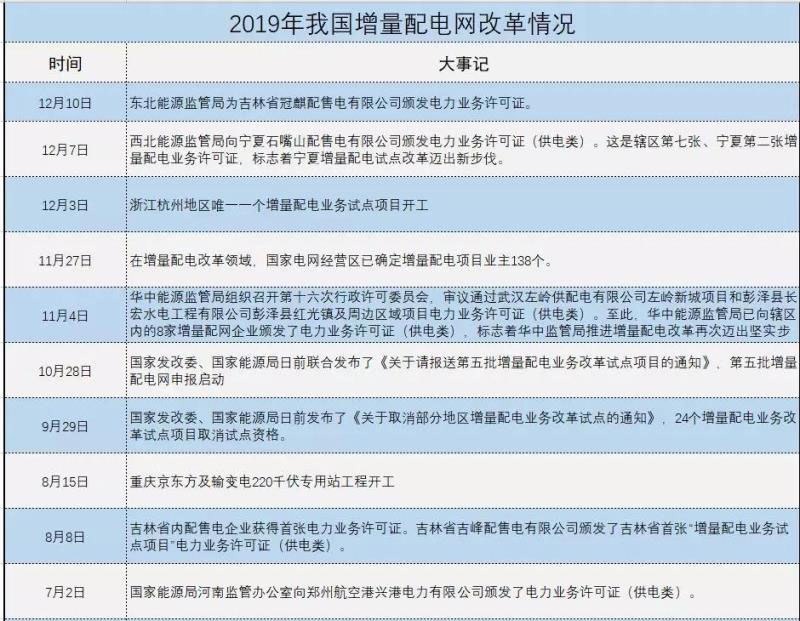 我國增量配網(wǎng)改革穩(wěn)步推進(jìn)。2019年初,國家發(fā)改委、國家能源局發(fā)布《關(guān)于進(jìn)一步推進(jìn)增量配電業(yè)務(wù)改革的通知》。6月份,國家發(fā)改委公布第四批增量配電業(yè)務(wù)改革試點(diǎn)名單,10月份,第五批增量配電業(yè)務(wù)改革試點(diǎn)開始申報(bào),截止日期為2019年12月31日。國家能源局各派出機(jī)構(gòu)提升了核發(fā)電力業(yè)務(wù)許可證(供電類)步伐,其中南方能源監(jiān)管局、華中能源監(jiān)管局、東北能源監(jiān)管局派出機(jī)構(gòu),降低審批流程,提升效率,保證增量配網(wǎng)試點(diǎn)穩(wěn)步推進(jìn)。為很多省份增量配電網(wǎng)頒發(fā)首張電力業(yè)務(wù)許可證(供電類)。