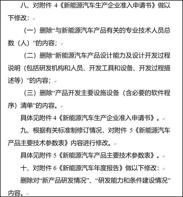 三、其他修改內(nèi)容以刪減為主,如原第二十九條、第三十條、第三十一條內(nèi)容被刪除,如附件4《新能源汽車生產(chǎn)企業(yè)準(zhǔn)入申請(qǐng)書》中,刪除了“與新能源汽車產(chǎn)品有關(guān)的專業(yè)技術(shù)人員總數(shù)(人)”、“新能源汽車產(chǎn)品設(shè)計(jì)能力及設(shè)計(jì)開發(fā)過程說明(包括研發(fā)機(jī)構(gòu)和人員、開發(fā)工具和設(shè)備、開發(fā)過程描述等)”、“產(chǎn)品開發(fā)主要設(shè)施設(shè)備(含必要的軟件程序)清單”等內(nèi)容。