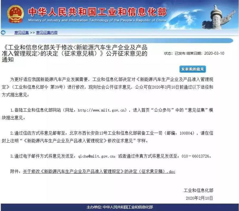 在此背景下,2月10日工信部發(fā)布了“關(guān)于修改《新能源汽車生產(chǎn)企業(yè)及產(chǎn)品準(zhǔn)入管理規(guī)定》的決定(征求意見稿)”。