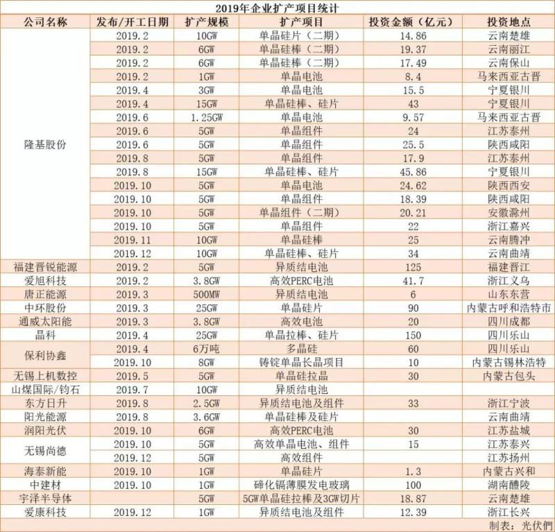 從技術(shù)層面看,半片、多主柵、疊瓦、PERC、HJT、大硅片、鈣鈦礦……從2018年開始,光伏行業(yè)的技術(shù)迭代非??焖?,以單晶PERC為代表的主流高效技術(shù)的崛起,已經(jīng)壓垮了一批多晶路線上的堅(jiān)守者。隨著行業(yè)競(jìng)爭(zhēng)的加劇,以及下游對(duì)于平價(jià)的要求,跟不上市場(chǎng)需求或者“賭”錯(cuò)技術(shù)路線的企業(yè)勢(shì)必將被淘汰出局,而押中了的企業(yè)則強(qiáng)者恒強(qiáng)。據(jù)光伏們統(tǒng)計(jì),僅2019年,以隆基股份、中環(huán)股份、愛旭科技、晶科能源、通威太陽(yáng)能、東方日升等為代表的中國(guó)光伏企業(yè)已經(jīng)宣布了超過200GW的擴(kuò)產(chǎn)計(jì)劃,投資金額累計(jì)超過1000億元。