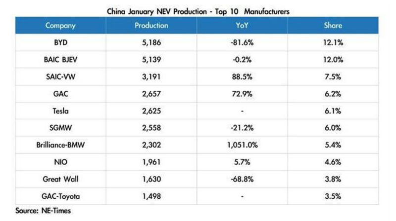 中國(guó)儲(chǔ)能網(wǎng)訊:北京時(shí)間2月13日上午消息,據(jù)外媒報(bào)道,1月份對(duì)特斯拉的上海超級(jí)工廠而言,十分重要。中國(guó)制造的Model 3的生產(chǎn)終于在2019年試生產(chǎn)之后變得熱火朝天。報(bào)道顯示,即便因?yàn)檗r(nóng)歷新年工廠放假休息、隨后又遇上冠狀病毒爆發(fā),上海超級(jí)工廠在1月份仍可以生產(chǎn)制造2600多輛中國(guó)制造的Model 3。這樣的產(chǎn)能,讓特斯拉在2020年1月份在中國(guó)生產(chǎn)的電動(dòng)汽車(chē)數(shù)量居該國(guó)第五位。