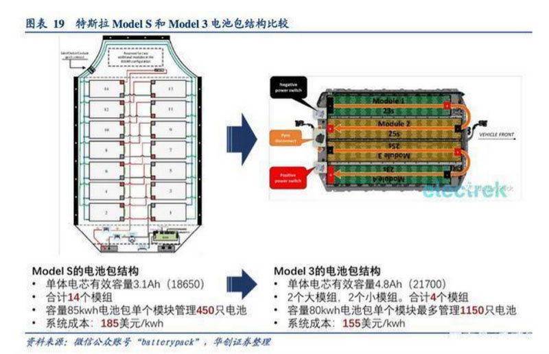 另外,如前文所述,采用三元材料鋰電池的日常LEAF也通過近10年3代電池結(jié)構(gòu)的設(shè)計,實現(xiàn)了電池包能量密度和成組效率提升。特斯拉的ModelS和Model3的電池包比較,也可以看到提升對電池管理能力,降低對電池包結(jié)構(gòu)的硬件冗余設(shè)計,是當(dāng)前車企在電池包成本優(yōu)化性能提升的殊途同歸之策。