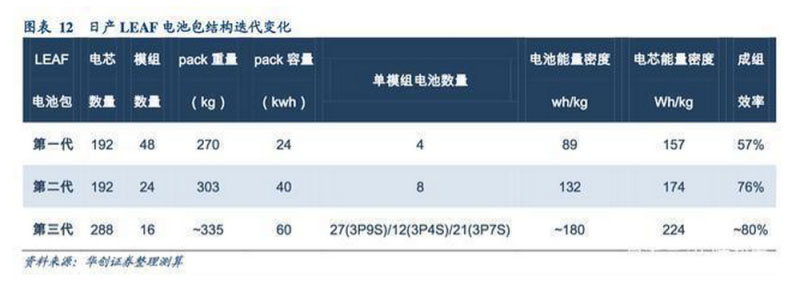 從電池包結(jié)構(gòu)角度看,LEAF也在通過電芯容量提升,及電池Pack結(jié)構(gòu)設(shè)計的迭代,來實現(xiàn)電池包容量,和成組效率提升。