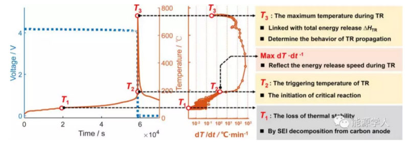 熱分析數(shù)據(jù)庫的建立促進了對于電池熱失控定義的共同認識?;谠摂?shù)據(jù)庫,歐陽明高院士提出了商品化鋰離子電池熱失控過程中的三個特征溫度—T1、T2、 T3。其中,T1代表的是電池反常產(chǎn)熱的起始溫度,它能夠反映電池整體的安全性,通常是由負極材料的氧化還原反應所造成的。T2是區(qū)分漸變式升溫與劇烈升溫的臨界點,也被視為是電池熱失控的引發(fā)溫度。具有較高T2溫度的鋰離子電池通常更容易通過針刺等安全測試。T3是電池熱失控過程中能夠達到的最高溫度,常常與電池總體產(chǎn)熱呈正相關并決定著熱失控的程度。這三個熱失控過程中的特征溫度對于定義熱失所處階段和評估其影響提供了參考。