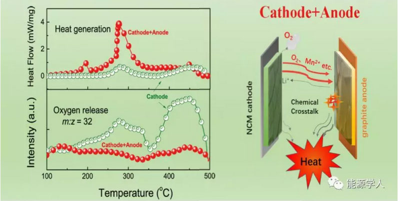 通常條件下,人們認為鋰離子電池的熱失控是在濫用條件下由內(nèi)短路引發(fā)的,或者說至少熱失控過程會伴隨著隔膜收縮等問題引發(fā)的電池內(nèi)短路。然而,歐陽明高院士最近的一篇Joule文章首次報道了電池在不發(fā)生內(nèi)短路的情況下仍然會發(fā)生嚴重的放熱。這是由于正負極化學交叉造成的:三元正極充電過程中發(fā)生相變釋氧,高氧化性的氣體與高還原性的鋰化負極發(fā)生反應導致電池劇烈放熱從而發(fā)生熱失控。