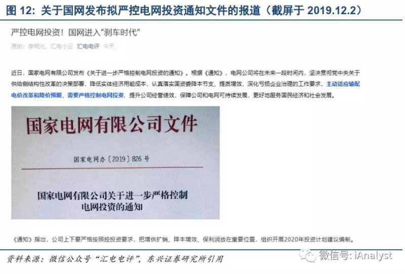 據(jù)微信公眾號“匯電電評”2019年12月2日報道(如圖12所示),國家電網(wǎng)公司(簡稱“國網(wǎng)”)發(fā)布《關(guān)于進(jìn)一步嚴(yán)格控制電網(wǎng)投資的通知》,將“降低實體經(jīng)濟(jì)用能成本,認(rèn)真落實國資委降本節(jié)支、提質(zhì)增效,深化虧損企業(yè)治理的工作要求,主動適應(yīng)輸配電價改革和降價預(yù)期,需要嚴(yán)格控制電網(wǎng)投資”。該《通知》就嚴(yán)格控制電網(wǎng)投資,提出三點要求:1)以凈利潤為核心,不得在投資計劃外安排輸變電資產(chǎn)租賃,不得以投資、租賃或合同能源管理等方式開展電網(wǎng)側(cè)電化學(xué)儲能設(shè)施建設(shè),不再安排抽水蓄能新開工項目;2)虧損單位不增新投資;3)新項目保證先落實送售電協(xié)議,后開工建設(shè)。