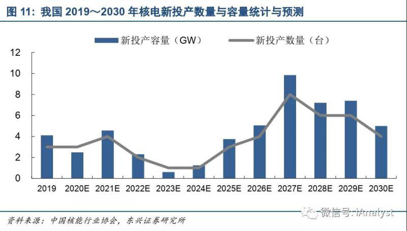 基于上述統(tǒng)計和預(yù)測,我們預(yù)計,到2030年底,我國大陸投運的核電機(jī)組累計將達(dá)到89臺、98.2GW,2030年核能發(fā)電量占比將達(dá)到6.69%;如相關(guān)項目建設(shè)推進(jìn)順利,2027~2029年或?qū)⒊霈F(xiàn)一輪核電投運小高峰,如圖11所示。由于核電項目審批流程較為嚴(yán)格,上述項目實際進(jìn)度或偏離我們的預(yù)期。