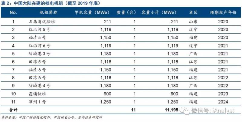 截至2019年底,在建核電機(jī)組有11臺,合計容量11.20GW,預(yù)計將于2020~2024年投產(chǎn),如表2所示。