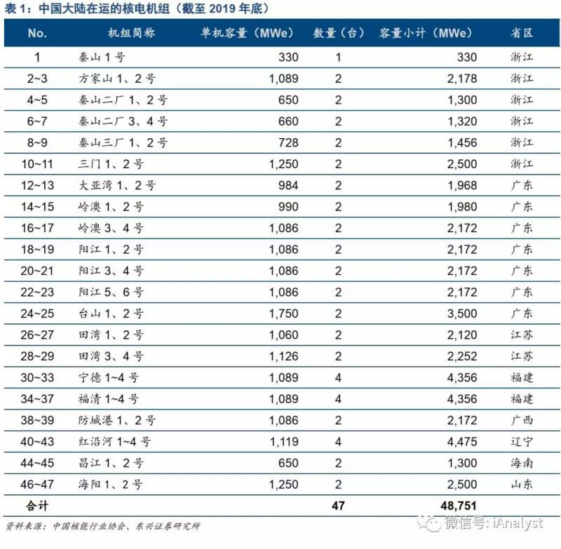 截至2019年底,我國大陸地區(qū)在運行核電機(jī)組有47臺,合計容量48.75GW,如表1所示。