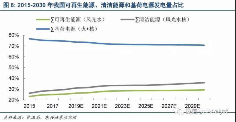我們同時預(yù)計,2020年、2025年、2030年,火電對于發(fā)電量的貢獻(xiàn),將分別降至68.4%、66.3%、64.0%,如圖7所示;可再生能源(風(fēng)、光、水)發(fā)電量占比分別為26.7%、28.7%、29.3%,基荷電源(火電+核電)發(fā)電量占比分別為73.3%、71.3%、70.7%;清潔能源(風(fēng)、光、水、核)發(fā)電量占比分別為31.6%、33.7%、36.0%??梢姡娏οM結(jié)構(gòu)在保證必要的基荷電源占比前提下實現(xiàn)一定的優(yōu)化,如圖8所示。