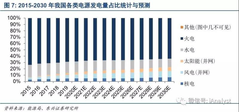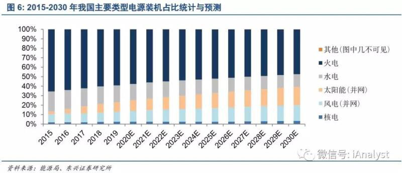 為滿足用電量增長、抑制平均能耗上升的需求,發(fā)電裝機(jī)亦將持續(xù)增長,且清潔能源占比將進(jìn)一步提高。我們預(yù)計,2020年底、2025年底、2030年底,中國大陸各類電源裝機(jī)總?cè)萘繉⒎謩e達(dá)到2,124GW、2,566GW、2,930GW,火電裝機(jī)占比分別降至57.6%、52.0%、47.3%,如圖6所示。