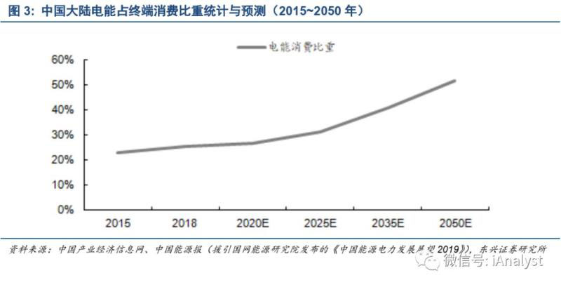 我們認(rèn)為,電能替代將成為未來多年的用電量重要增量來源。據(jù)中國產(chǎn)業(yè)經(jīng)濟(jì)信息網(wǎng)2019年11月1日報道,2017、2018年全國電能替代量分別達(dá)1286億kWh、1577億kWh,占當(dāng)年全社會用電量的2.0%、2.3%;電能占終端能源消費比重從2015年的22.9%提高到2018年的25.5%;另據(jù)《中國能源報》(2019年12月9日第2版)援引國網(wǎng)能源研究院發(fā)布的《中國能源電力發(fā)展展望2019》預(yù)測,到2020、2025、2035、2050年,電能占終端能源消費比重將分別達(dá)到26.5%、31.4%、40.6%、51.7%。上述統(tǒng)計及預(yù)測數(shù)據(jù)如圖3所示。