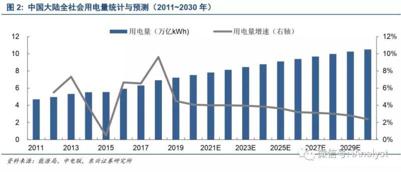 展望未來十余年,結(jié)合電能替代、工商業(yè)發(fā)展、人口增長等因素的驅(qū)動,以及經(jīng)濟(jì)調(diào)結(jié)構(gòu)、控能耗等相關(guān)政策落實推進(jìn),我們預(yù)計,2020年、2025年、2030年,中國大陸全社會用電量將分別達(dá)到7.52萬億kWh、9.10萬億kWh、10.50萬億kWh,2019~2025年、2025~2030年的年均復(fù)合增速分別為3.92%、2.90%,如圖2所示。